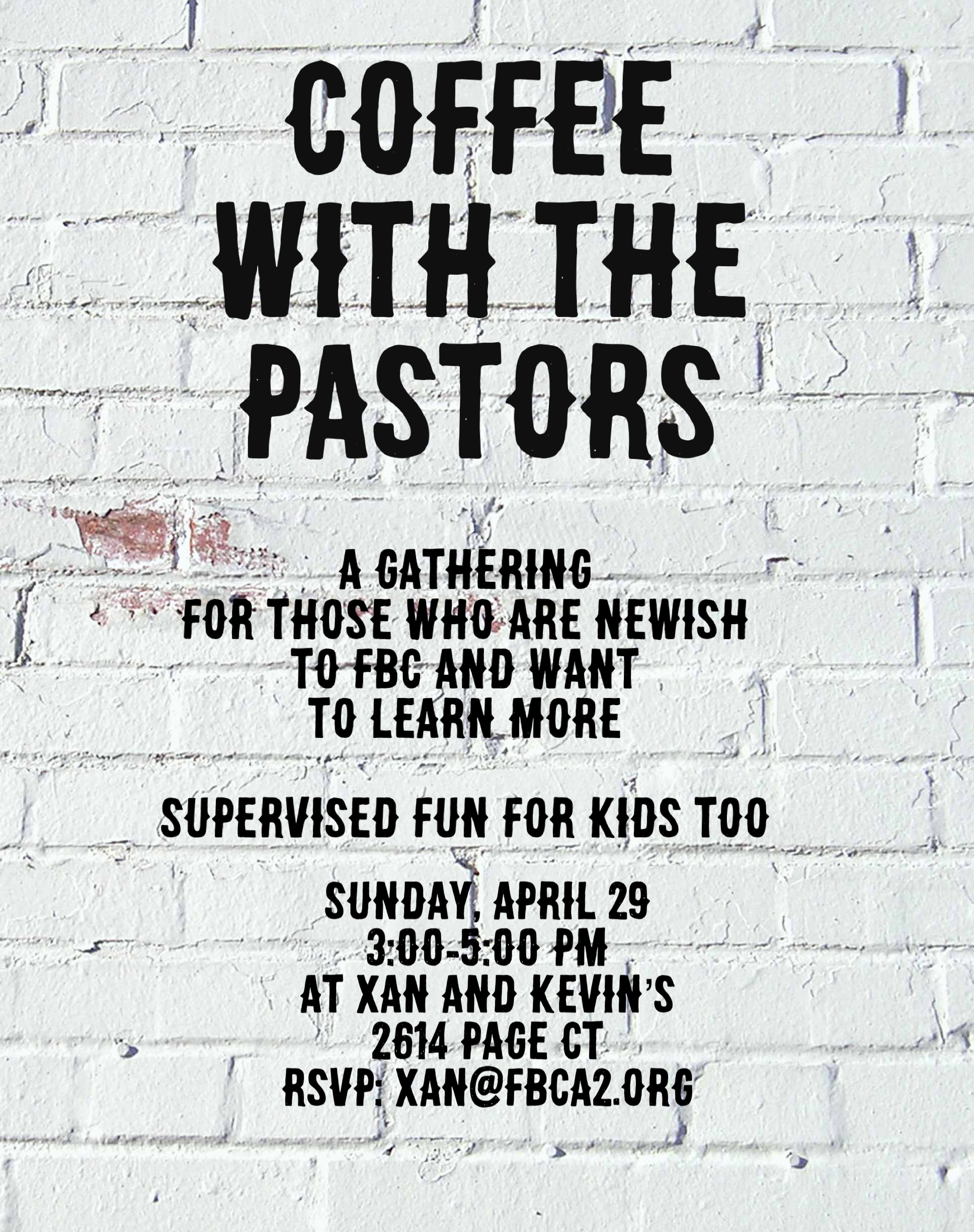 If you are new, or newish to First Baptist Church, we invite you to join us for an informal gathering with Paul and Stacey on Sunday, April 29th from 3:00-5:00 pm at Xan and Kevin’s (2614 Page Ct). We’ll have coffee, pastries and good conversation. Come learn more about our life together at FBC and ask any questions you may have. There will be supervised fun for the kids. Please RSVP to Xan (xan@fbca2.org).